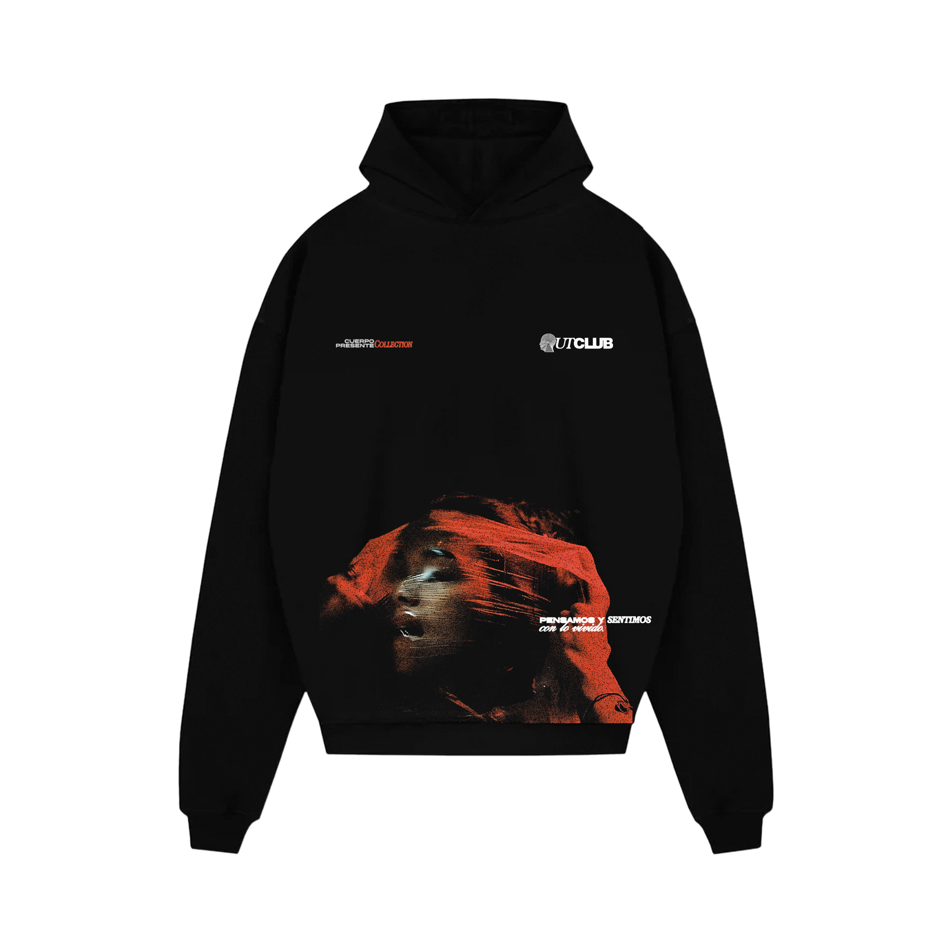 Tu cuerpo es la casa de tus sentimientos: late con la emoción, se estremece con la tristeza, vibra con la alegría y se calma en la paz. Cada sensación se refleja en la forma en que habitas tu piel, y la moda se convierte en un puente para expresarlo hacia afuera. Vestirse es también hablar sin palabras, es mostrar lo que sientes y llevarlo contigo. En “Cuerpo Presente” lo representamos con un buzo negro de alto gramaje, confeccionado en 100% algodón de 410 gr/m², que combina resistencia y comodidad para acompañar cualquier estado del alma. Su estampado en semitonos DTF, presente al frente y en la espalda, es una huella gráfica de esos sentimientos: una pieza que envuelve tu cuerpo y proyecta tu mundo interior.