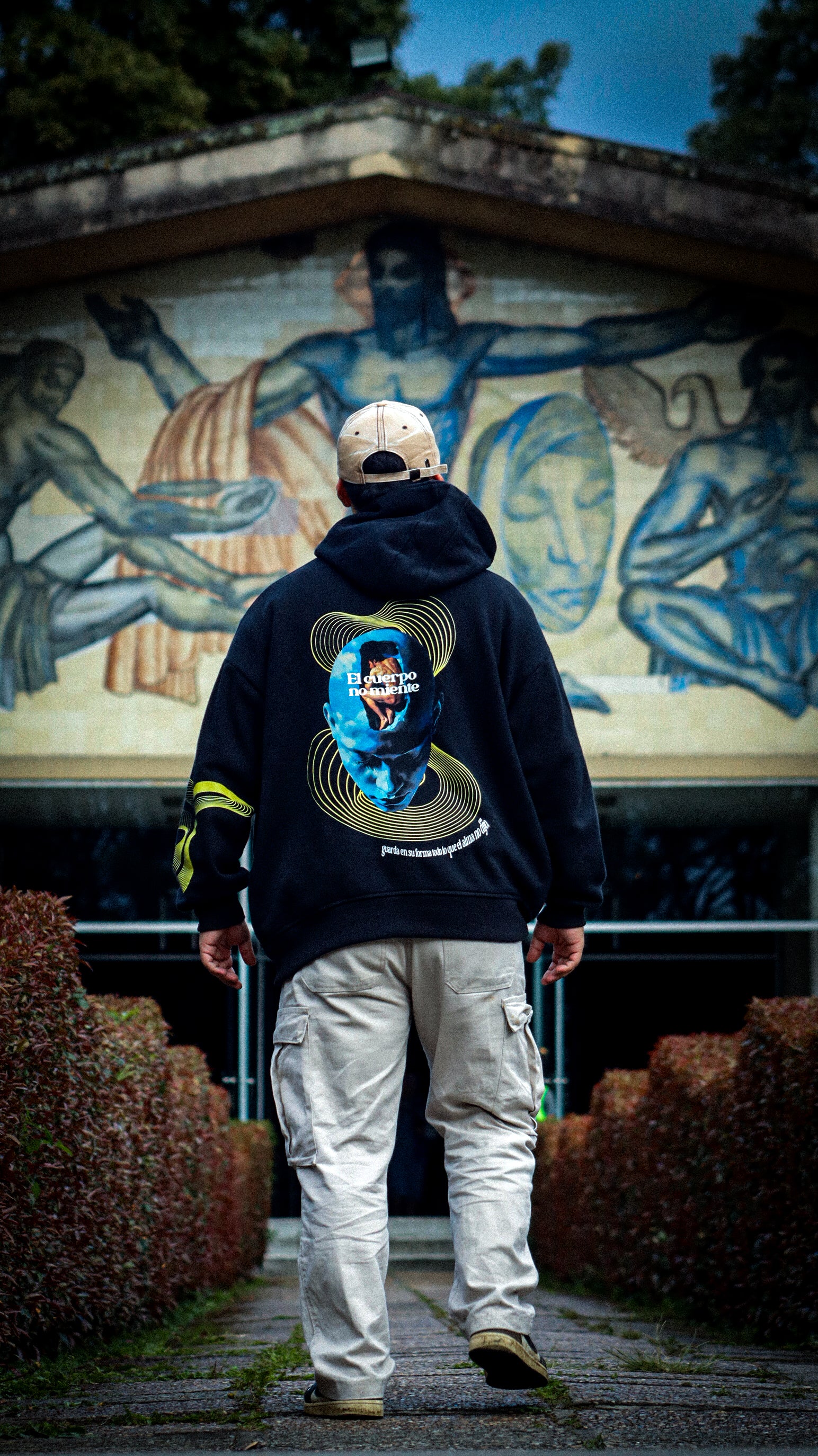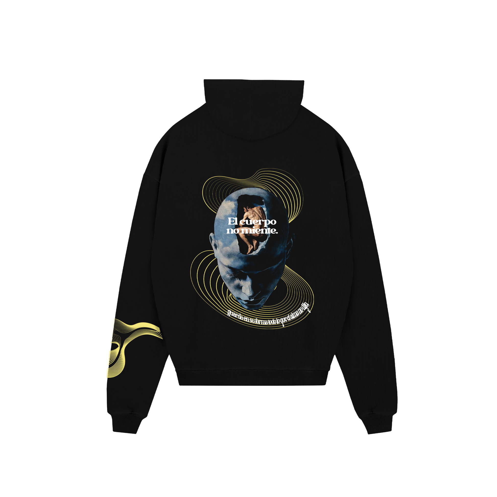 Escuchar tu cuerpo es un acto de conciencia: saber cuándo moverte, cuándo parar, cuándo respirar más profundo o simplemente dejarte sentir. Cada señal que emite es una guía, un lenguaje propio que te mantiene presente. La moda también puede ser esa voz: cómoda, fuerte y fiel a lo que eres. En “Cuerpo Presente” lo expresamos con un buzo negro de alto gramaje, confeccionado en 100% algodón de 410 gr/m², diseñado para resistir y abrazar cada instante. Su estampado en semitonos DTF, al frente y en la espalda, es un recordatorio gráfico de esa escucha interna: una prenda que acompaña tu cuerpo mientras aprendes a oírlo y habitarlo con autenticidad.